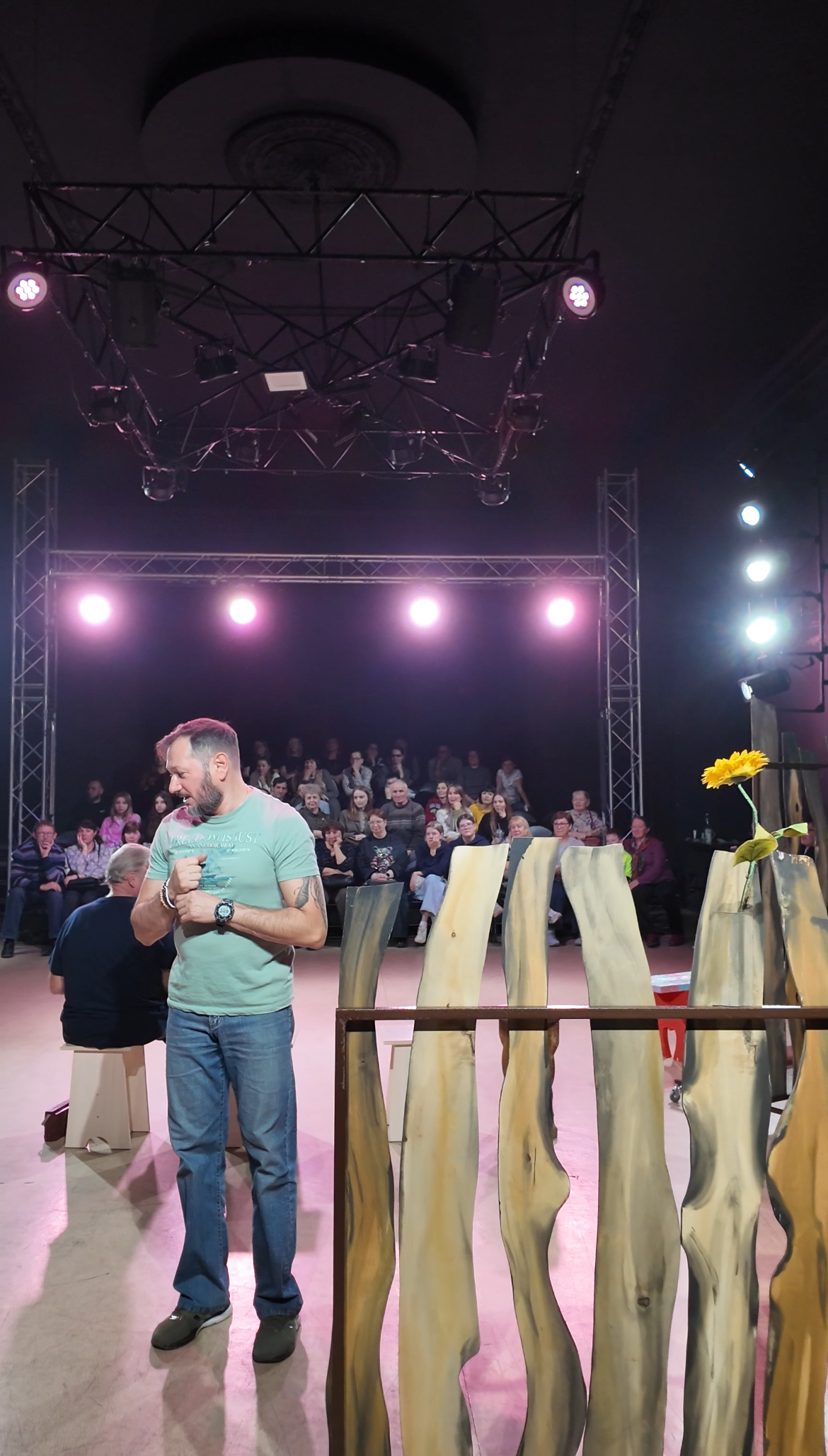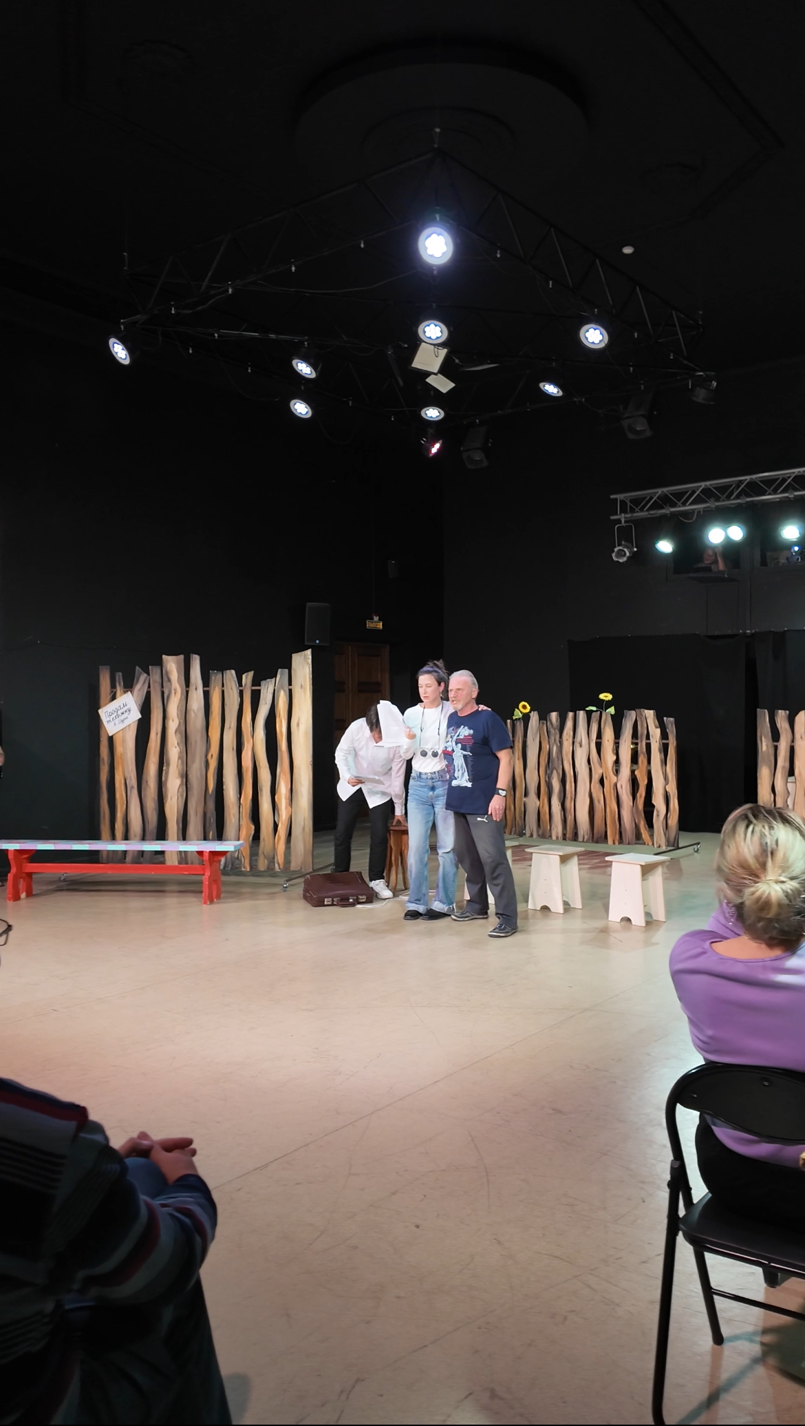 Кездесудің екінші бөлігінде көрермендер тек бақылаушы ғана емес, қатысушыға айналады: Режиссер қалағандарға сахнаға шығып, кейіпкерлердің бірінің рөлін сомдап көруге мүмкіндік береді. Мұндай тәжірибе театрдың ішкі жұмысын тереңірек түсінуге және оның қаншалықты күрделі әрі қызықты еңбек екенін сезінуге мүмкіндік береді.